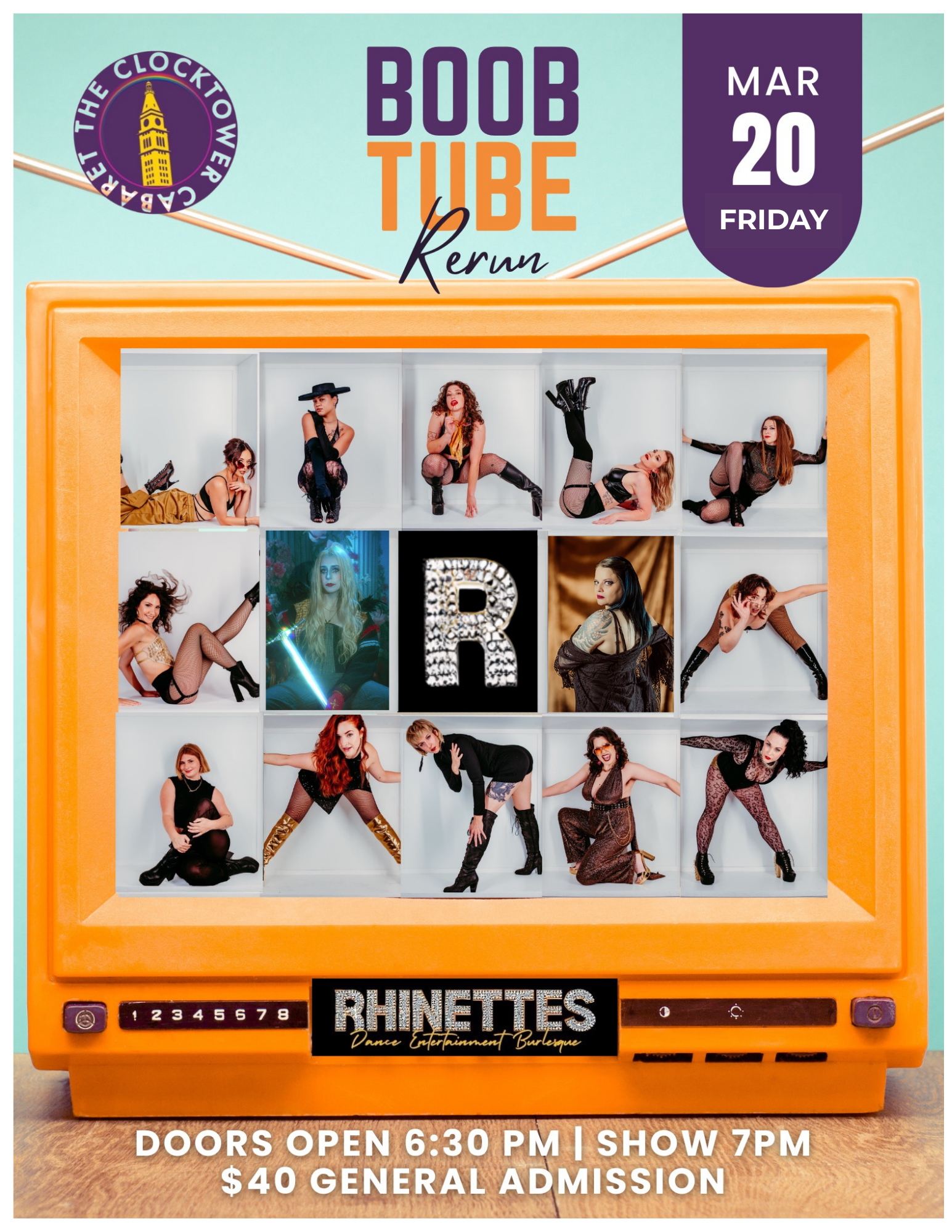Prepare yourself for the Boob to Burlesque RERUN featuring the Rhinette's, a bold and whimsical tribute that reinvents cherished TV shows and films like K-Pop Demon Hunters, British Bake Off, and Grey's Anatomy in a stunning burlesque format. Delight in electrifying performances that intertwine humor and seduction. Join us for an evening of playful entertainment where each act honors the beloved shows we hold dear!